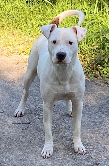 Keller is a beautiful pit mix girl that had been living in an abandoned house. On of our rescue partners had been feeding and giving her water daily but she was very standoffish and would not let us close. As the weeks and months wore on, we noticed that she would not arouse sometimes when we arrived to feed her and we realized that this sweet girl was DEAF! We continued to feed her daily but winning her over was not happening. She was happy for the food and water, but was too fearful to let us touch her. Finally, the day came that we were able to sneak up on her while she slept and slip a leash over her head and at long last, we had our girl.
